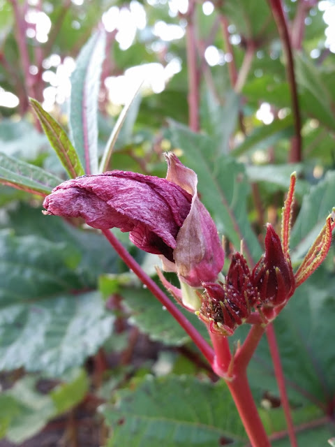 Dead flower being cast off a new green pod beside dark red day-old pod
