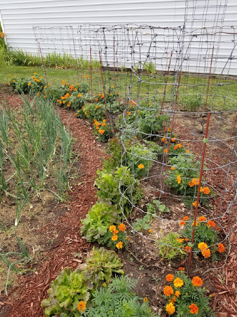 It finally cooled off enough after the rain that I was able to get them caged as well.  Since the weather last year was brutal on cucurbits, I didn't get any cucumbers or melons, so my experiment of masking the smell of ripe canteloupe from raccoon temptation with marigolds didn't work out.  I'm trying again this year.